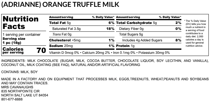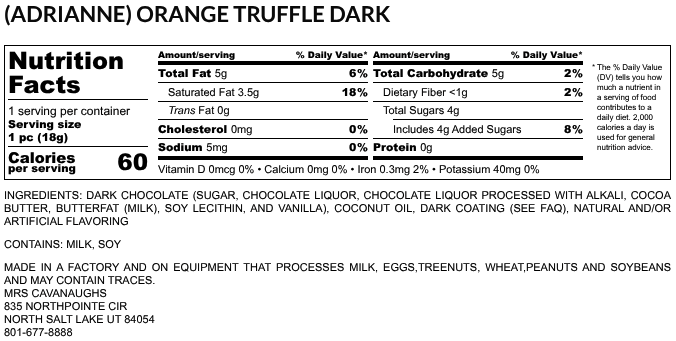 Indulge in the rich, creamy flavor of our Adrianne Orange Truffle, a delicious combination of tangy orange truffle smothered in smooth milk or dark chocolate. Named after Mrs. Cavanaugh’s granddaughter, Adrianne, these luxurious truffles are a special treat that carries on a sweet family tradition. The zesty orange center and velvety chocolate coating create a perfect balance of flavors that will leave you craving more.