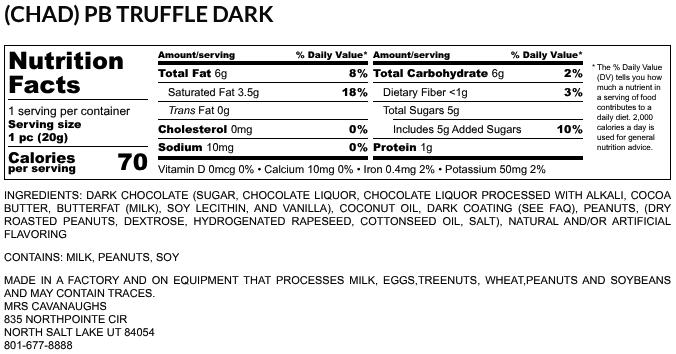 Chads are a peanut butter truffle, coated in delicious milk chocolate and diced peanuts. Mrs. Cavanaugh started a tradition of naming her chocolates after grandchildren. Chad is the lucky grandchild to have these delicious peanut butter truffle chocolates named after him.