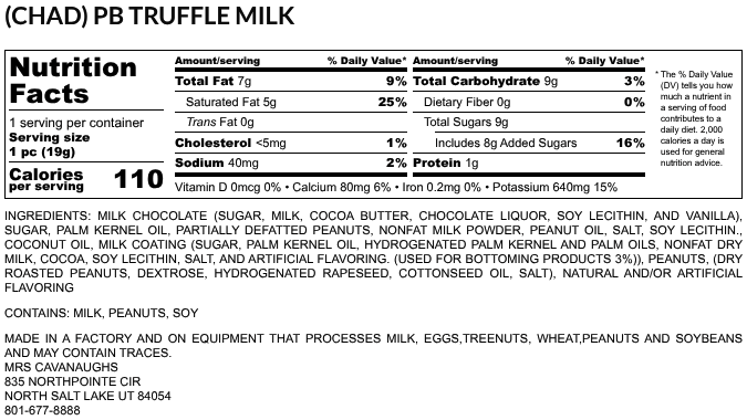 Chads are a peanut butter truffle, coated in delicious milk chocolate and diced peanuts. Mrs. Cavanaugh started a tradition of naming her chocolates after grandchildren. Chad is the lucky grandchild to have these delicious peanut butter truffle chocolates named after him.