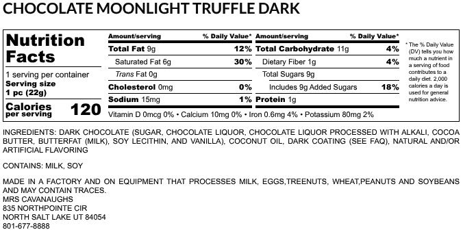 Introducing the Moonlight Chocolate Truffle from Mrs Cavanaugh's Chocolate. If you're a dark chocolate enthusiast, prepare to be transported to chocolate heaven. This smooth and decadent truffle is a true delight for the senses.