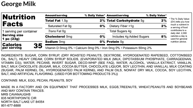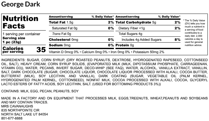 Try our new George Chocolate, named after our Father, Grandfather, and founder George Cavanaugh. This sweet and savory treat features a rich peanut butter nougat, smooth caramel, and crunchy peanuts, all smothered in either milk or dark chocolate, with stripes of the opposite chocolate for an extra touch of elegance. The peanut butter nougat has a soft and smooth texture that’s simply irresistible. Our caramels are made the old-fashioned way, cooked for over six hours to develop a full, natural flavor without any artificial additives or preservatives.