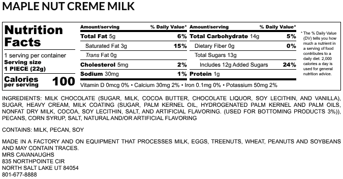 Satisfy your sweet tooth with the irresistible combination of creamy maple filling, crunchy pecans, and smooth milk chocolate. Maple Nut Crème is handcrafted from scratch using thick whipping cream, real pecans, and the finest ingredients—no shortcuts, no just-add-water mixes. The result? A rich, buttery treat that melts in your mouth and leaves you reaching for another.