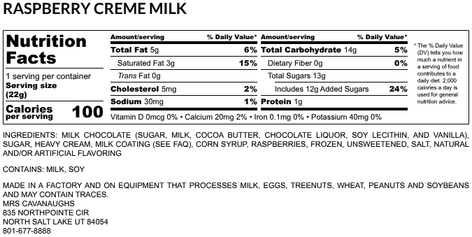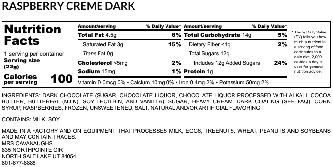 Our Raspberry Crèmes are created using a made-from-scratch recipe. We use only the highest-quality ingredients. We start with real raspberry fruit, blending them with thick whipping cream and sugar to create a luscious raspberry filling that is smooth and bursting with fresh, tangy flavor.