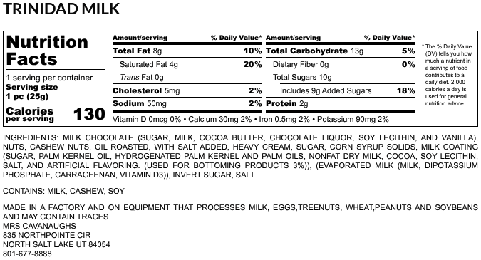 OMG! I have been searching throughout the US for a cashew caramel milk chocolate cluster for years. My favorite place in CT discontinued them. I stumbled on this site and ordered the cashew cluster thinking it had caramel. I later disocvered the Trinadads which tasted EXACTLY how I wanted them to taste. I only wish they were smaller so I didn't eat so much all at once! Impossible to eat just one. My mouth is watering now . Looking forward to next year when I will treat myself again.